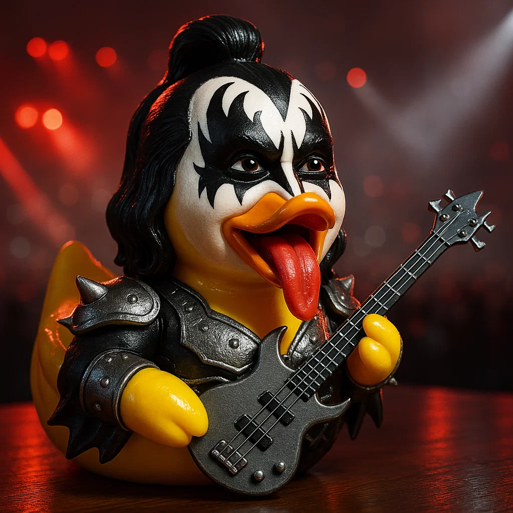 Silver "space eye" battle makeup × electric guitar × metal shoulder armor, Ace Frehley's classic stage image is condensed into a palm-sized little yellow duck.