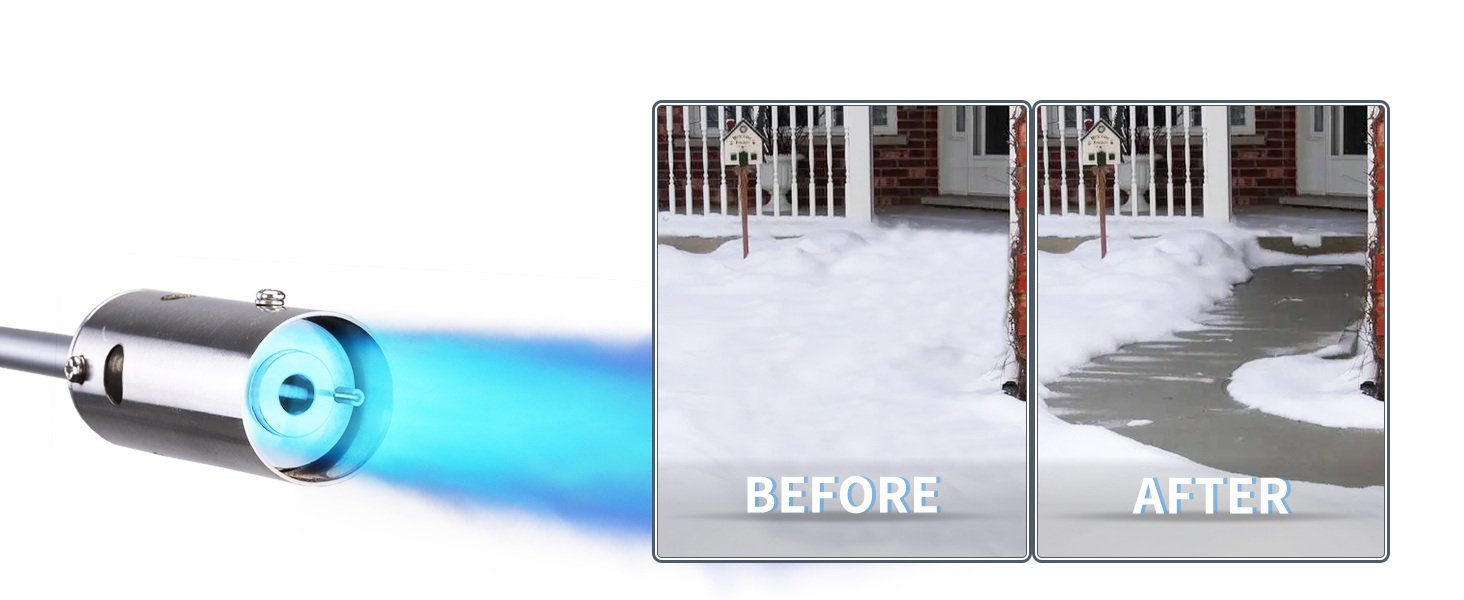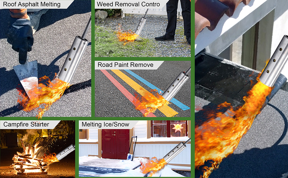 【Environmentally Friendly & Versatile】: The raw material of the blow torch is propane, which does not pollute the air or soil after combustion, ensuring the safety of our product. This flame thrower fire gun can be used to burn weeds and leaves, melt snow/ice, barbecue meat or fish, start fires, weld, burn wood grain, soften asphalt, and remove paint from non-flammable surfaces, making it ideal for home, garden, farm, industrial, and construction use.
